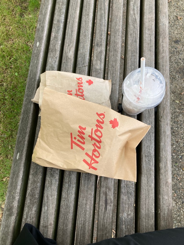 I headed down to the park below, Harbour Green Park, and found a bench on the side of the bike paths to eat my Tim Hortons.