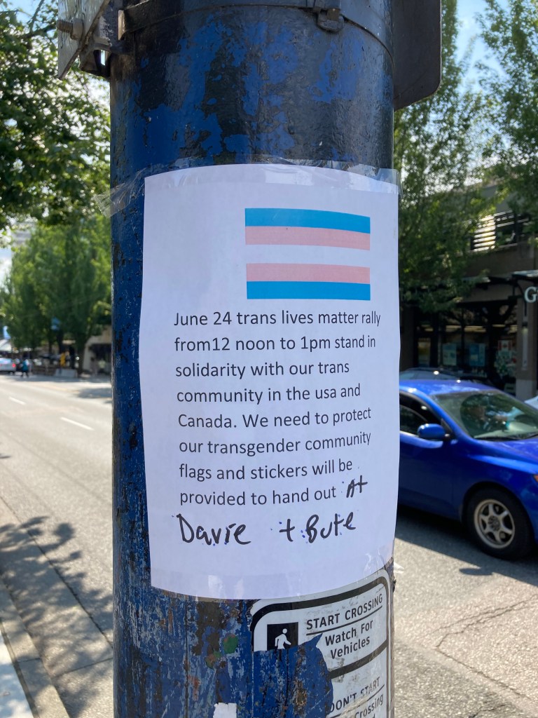 I walked all the way down Denman street. I saw an A&W and Tim Hortons on the way. I also saw a trans lives matter sign posted above a crosswalk button, something one would never see in Arizona.