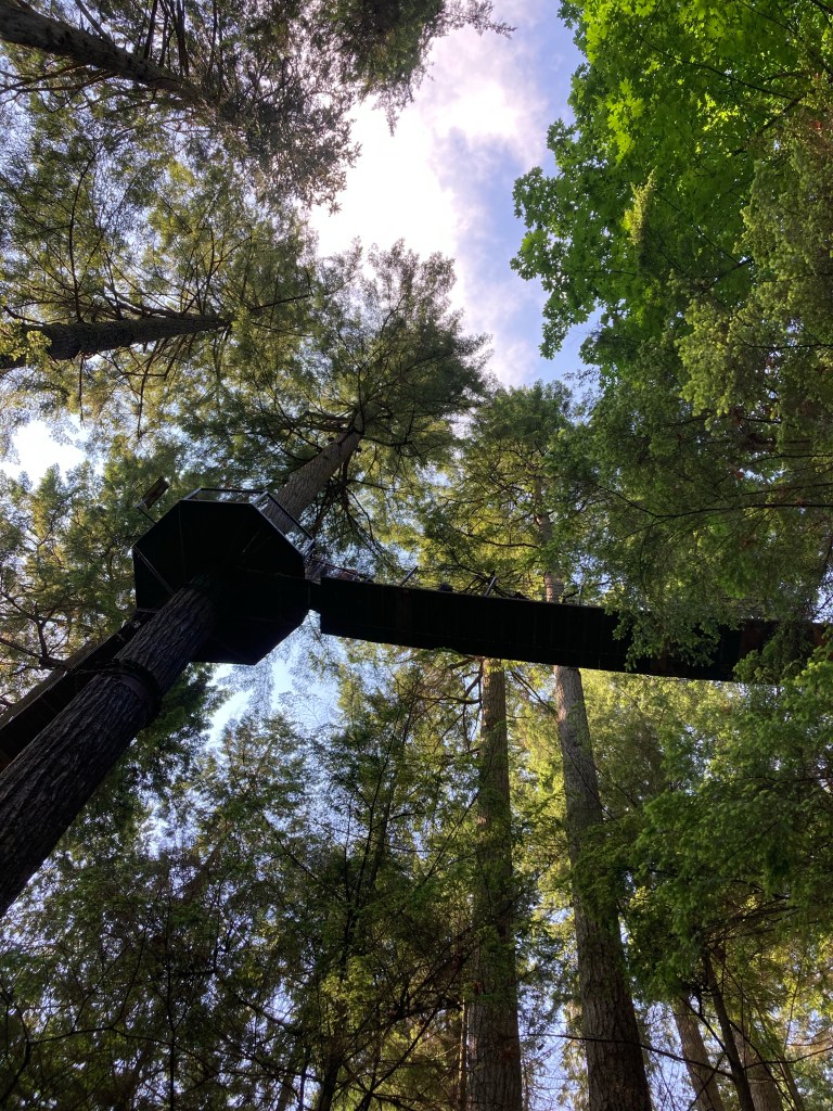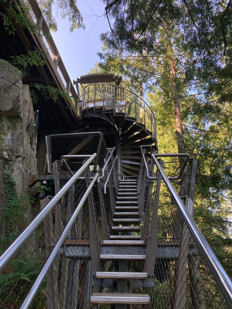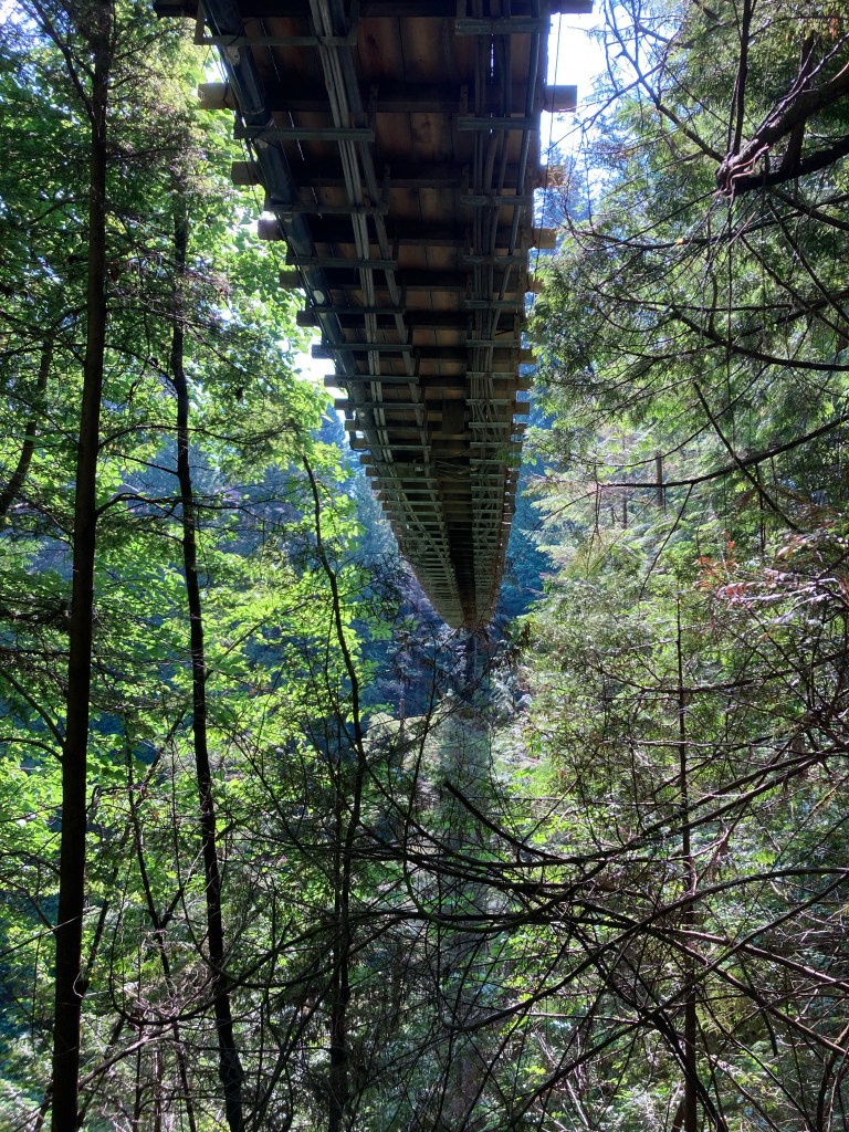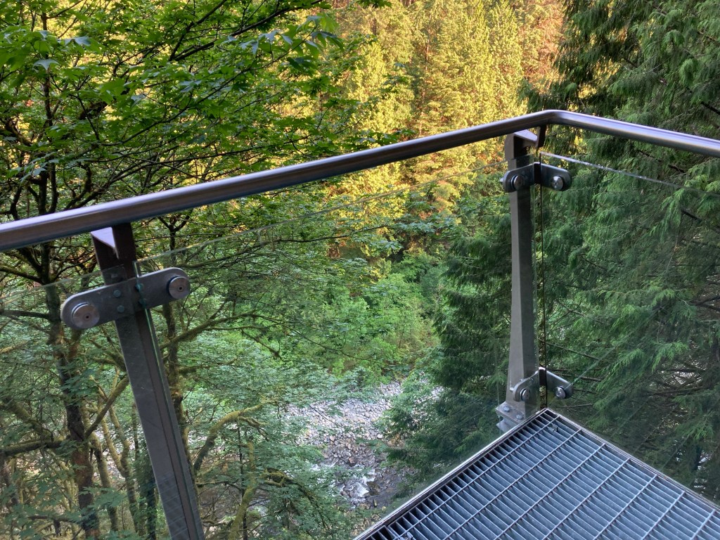 Walking down the spiral steps, I was filled with excitement as I saw the bridge and trees below. It truly was on a cliff’s edge. I could see how well-engineered the structure was; I felt safe.