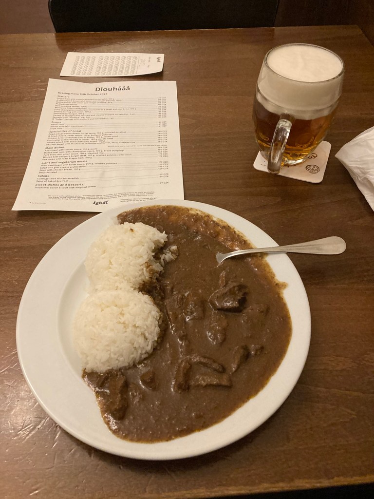 There was a menu brought out in English, and I saw what I wanted to order, which I had identified when I was outside; Veprová játra na cibuice, 150 g, dusená ryze (Pork livers with onion sauce, 150 g, steamed rice). The alternative was; Vareny hovèzi krk se zampionova omácka, 100g, houskové knedlíky (Boiled beef neck with mushroom sauce, 100g, bread dumplings), but I decided against it.