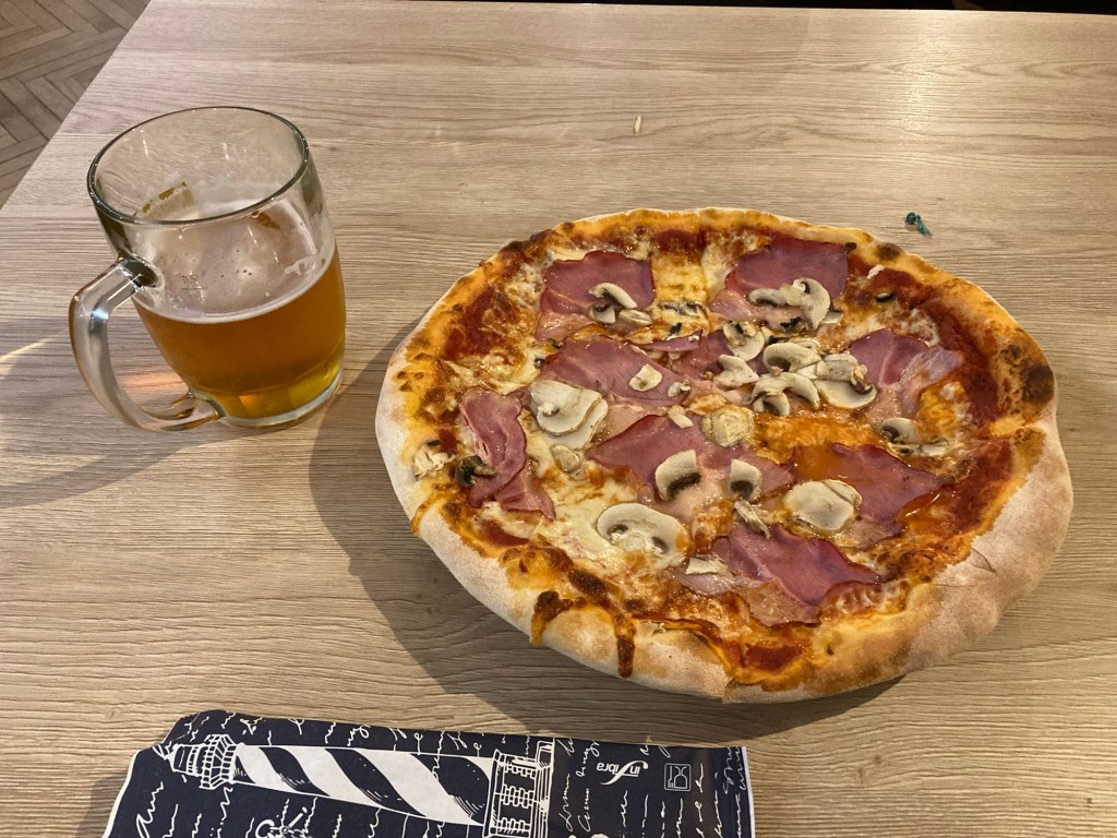 I saw some trams running, but it was only about a 10 minute walk to where I needed to go. I was inside by 23:13, and then I went to look for a restaurant since I was hungry. So by 23:55, I was on my way to a restaurant that was only a 4 minute walk away from where I was staying. The place I came across was called “Kafárna Na Kus Reci”. I had to stand outside and Google translate the menu, but I saw that they had pizza and burgers which was not hard to translate. I could read words such as dessert, gnocchi and risotto.