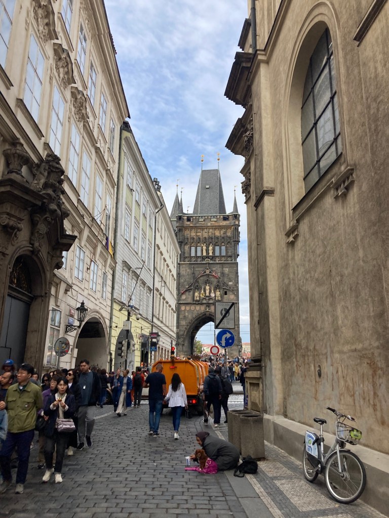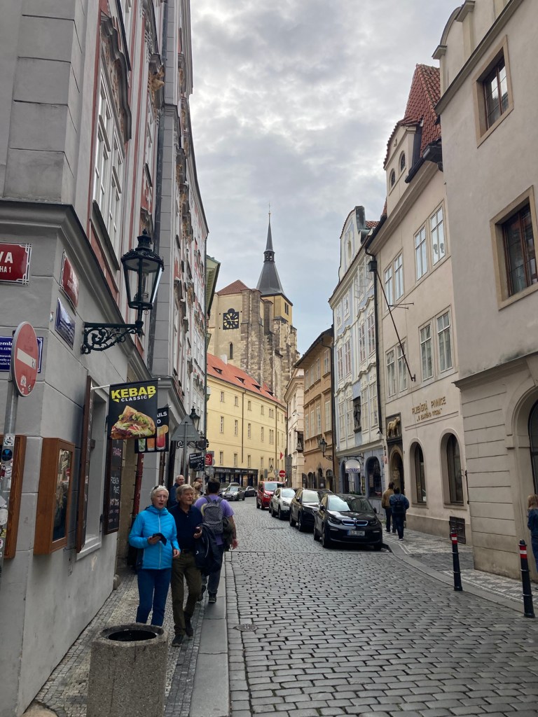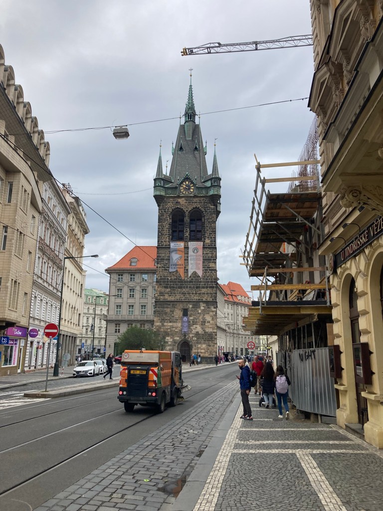 I walked through the square, which was quite busy, then eventually turned on a street on the right, where I could see a tower (the first of many). It, however, was not the Powder Gate Tower; this was Henry’s Bell Tower (Jindřišská věž). In its vicinity was a church.