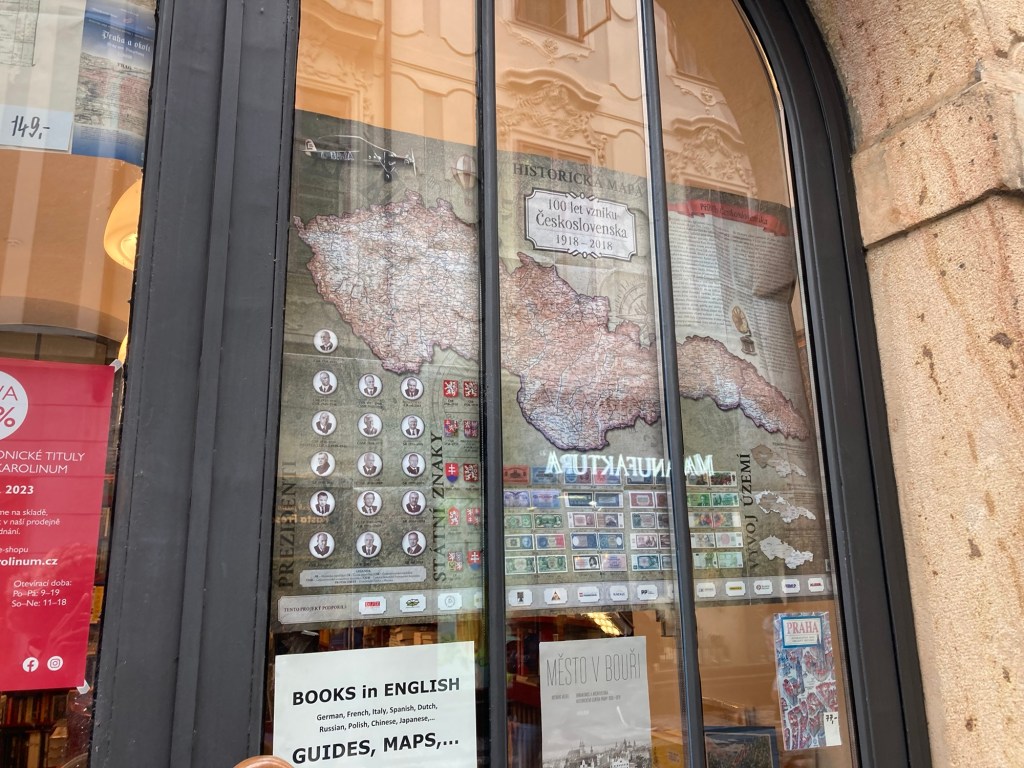 I saw a map of Czechoslovakia in a bookstore window. I passed by the Museum of Torture. From here, I saw the top of the Church of Our Lady before Týn (Kostel Matky Boží před Týnem).